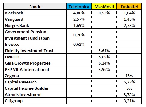 Norges Bank, que gestiona el mayor fondo soberano del mundo con las ganancias que obtiene Noruega del petróleo y el gas para garantizar las pensiones, ha invertido parte de su dinero en dos de las tres operadoras españolas. Por un lado, tiene un 1,69% de Telefónica (quinto mayor accionista); por otro lado, cuenta con una participación del 2,73% en Euskaltel. El otro gran fondo internacional, Vanguard, no podía quedarse atrás. Un 2,57% en Telefónica y un 1,43% en Euskaltel representan su posición en las operadoras.
