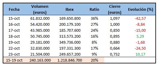 La volatilidad de la acción fue la nota predominante en las cuatro sesiones posteriores. Para desgracia de los accionistas, con mayoría de órdenes de venta. “El miedo es libre y ante la posibilidad de que valgan cero las acciones, los accionistas están vendiendo con fuerza”, declara Sergio Ávila, Market Analyst de IG. La semana cerró con un volumen total de 240 millones de euros y una caída del 53,4% en el valor de las acciones “estrella” del selectivo.