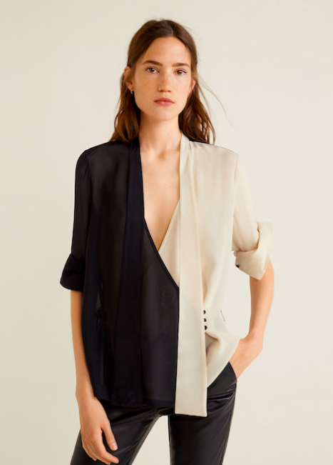 Tener una blusa fluida en el armario siempre es una buena opción, especialmente si la encuentras tan rebajada como es el caso. La blusa con diseño bicolor de Mango tiene un precio de 19,99 euros. El tejido de gasa de la blusa hace que sea muy cómoda de llevar a la vez que elegante.