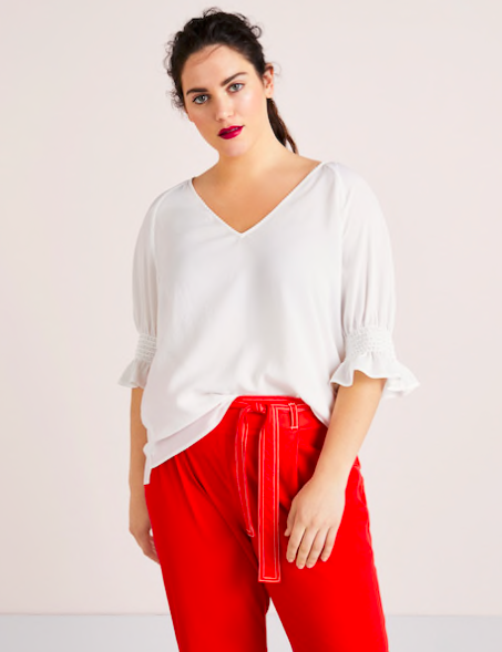 La colección Violeta by Mango también tiene algunos chollos para las chicas que tienen una talla superior a lo que solemos encontrar en las tiendas. Esta blusa con tejido fluido y diseño recto es un claro ejemplo de ello. Tiene un escote en pico, manga tres cuartos con volantes y, además, también tiene un escote en pico en la parte de la espalda.