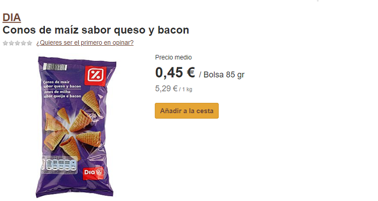 En este caso, gana el DIA, apuntándose el primer tanto. Sus conos de maíz con queso y bacon, cuestan menos de 50 céntimos, con una bolsa de 85 gramos bastante generosa, y con un excelente sabor. De este modo, le damos la victoria por ser unos céntimos más barata que la de los competidores.