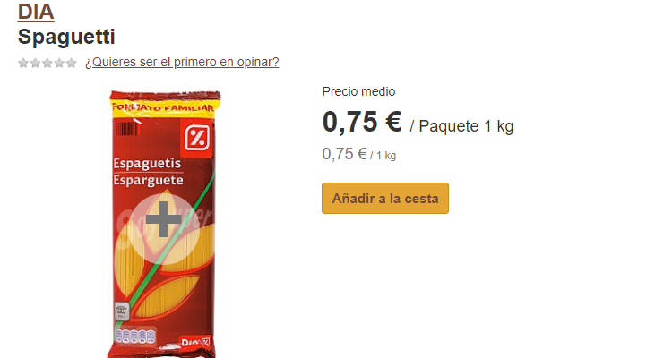 El precio, es de 0,75 euros por cada kilo de pasta, aunque en algunos lugares puede variar ligeramente el precio. De este modo, aunque demos la victoria para el DIA, técnicamente es un empate a 4, pues la diferencia en la cesta de la compra es insignificante con respecto a los otros supermercados, a menos que compres 10 kilos de pasta.