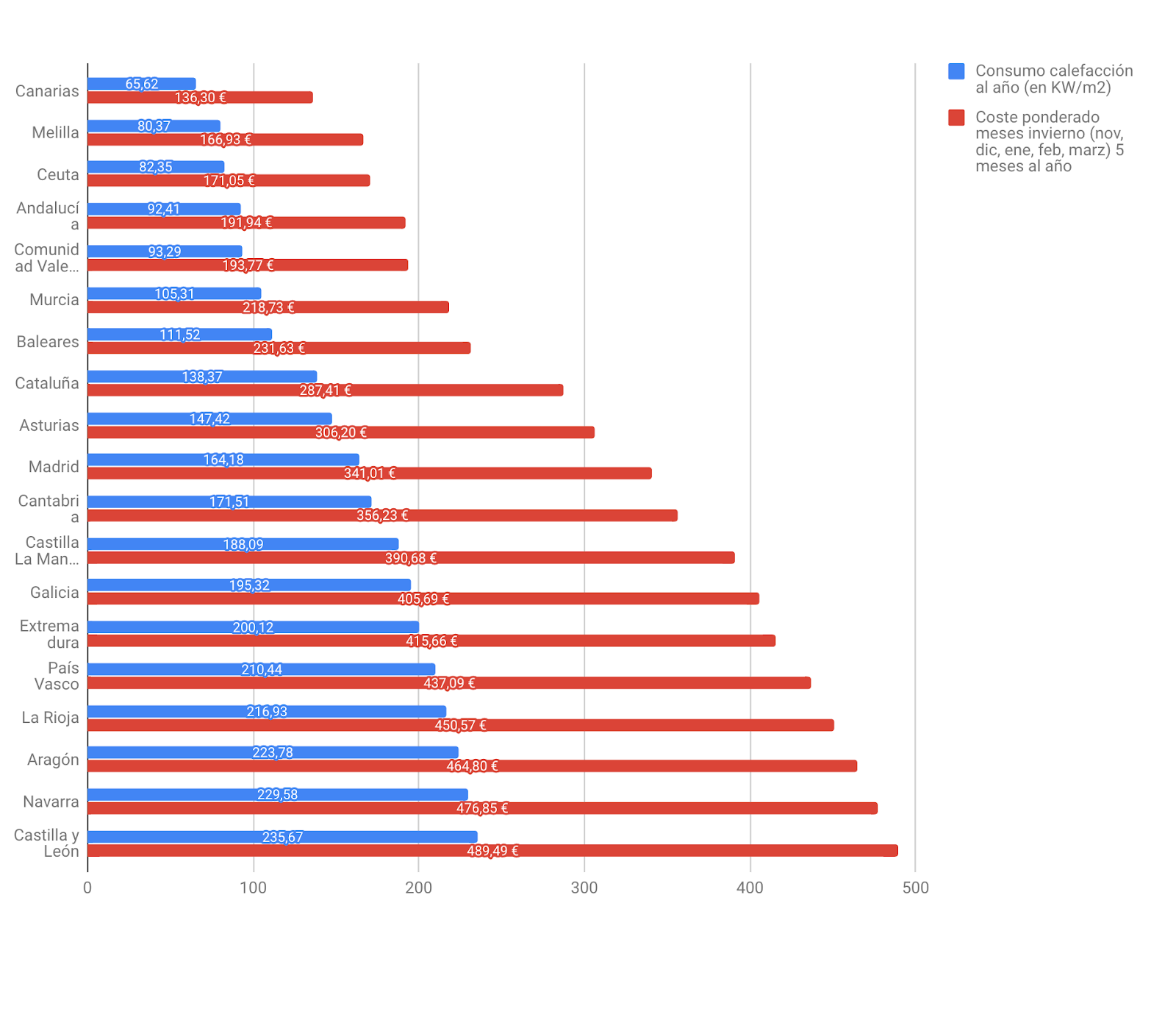Los datos de gasto medio en calefacción eléctrica en kw/m2 para una vivienda media de 75 metros cuadrados obtenidos mediante Tarifas Gas Luz y un estudio realizado por Certicalia, muestran que en las provincias más gélidas se podrían llegar a pagar casi 500 euros al mes en invierno para mantener sus casas a una buena temperatura. El gráfico se calcula con el precio medio de 0.13847€ kw/h de este año.