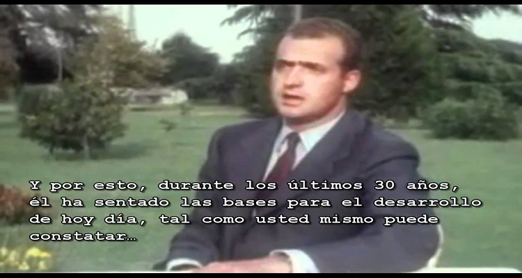 En 1970,el entonces príncipe Juan Carlos y heredero a la jefatura del estado, concedió una entrevista para una televisión de Suiza, en la cual, en un perfecto Francés, elogió a Franco, diciendo que había sacado a España de la segunda guerra mundial, que había sacado a España de la crisis en 1936, y que era un ejemplo para el desarrollo. Además, también alabó a Franco en muchas ocasiones poco después, como en su primer discurso de navidad, ya como Rey.