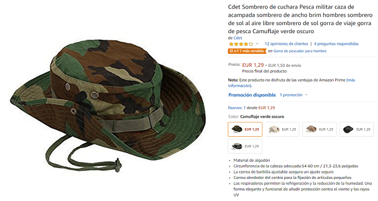 El precio de este sombrero, es de 1,29 euros más 1,50 euros de envío, el cual por ello, es el producto más vendido dentro de los gorros de pescadores para hombres. Además, este precio tan bajo, el cual no llega a los 3 euros sumando todo, está disponible para todos, es decir, sean o no de Amazon Prime.