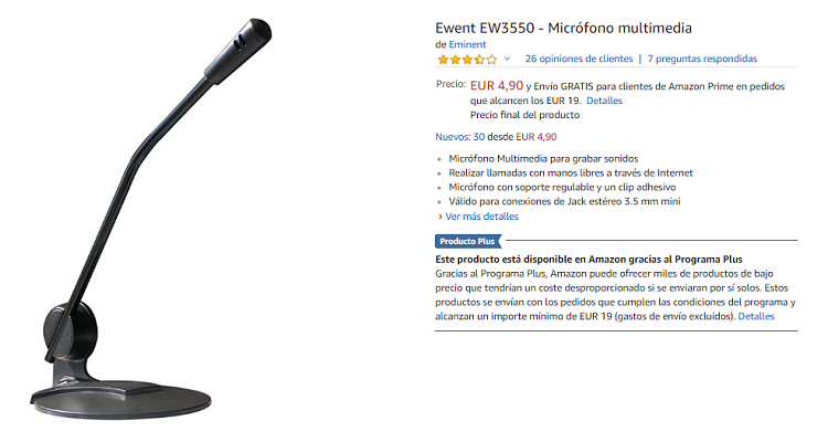 De este modo, tienes un micrófono que cuesta 4,90 euros. Eso sí, si eres de Amazon Prime, tendrás que hacer un pedido de 19 euros para que te salga gratis el envío. No es que tenga la mejor calidad de sonido del mundo, pero por 5 euros es un precio más que razonable para poder empezar a grabar mejor. Si quieres gastar más dinero, no dejes de visitar Amazon, pues es el rey de los micrófonos.