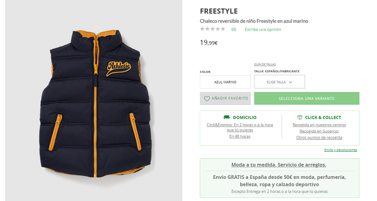 Su precio es de 19,99, y tenemos tallas desde los 4 años de edad, hasta los 16 años aproximadamente. Eso sí, consulta la guía de tallas, pues por ejemplo, 16 años de niño lo ponen como 1,72 de altura, y cuando yo tenía esa edad, medía 1,86.