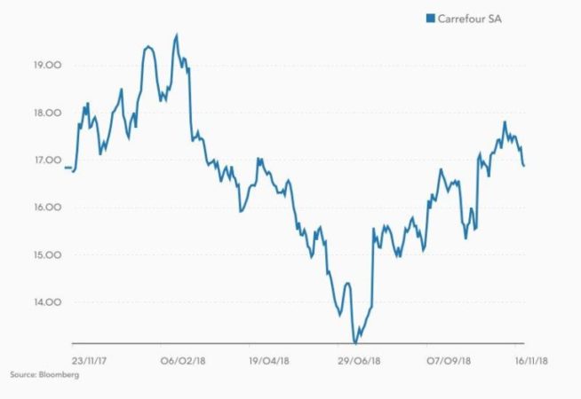 La situación económica y empresarial de la multinacional ha marcado la evolución de la acción. “La cotización de Carrefour ha estado muy condicionada por una primera mitad de año muy negativa, en la que el precio de los títulos del distribuidor francés pasó de los 19,73 euros en febrero a los 12,96 a mediados de julio, lo que supone una caída de casi un 35% en apenas cinco meses. Desde entonces, sus títulos han deshecho buena parte de ese retroceso y se mueven ahora en torno los 17 euros por acción”, explica el analista de IG, Aitor Mendez.