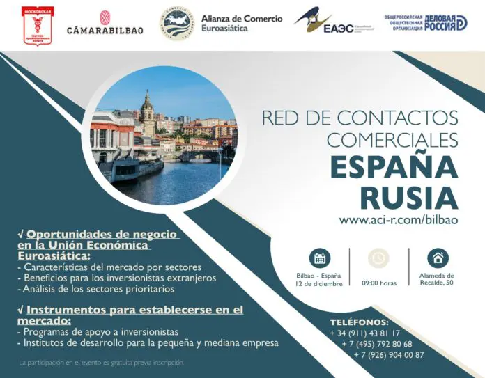 El próximo miércoles 12 de diciembre a las 9 de la mañana, en el Auditorio de la Cámara de Comercio de Bilbao, se celebra el evento ‘Red de contactos comerciales España-Rusia’. Un acto que reunirá empresarios de la Unión Económica Euroasiática y empresas del País Vasco.