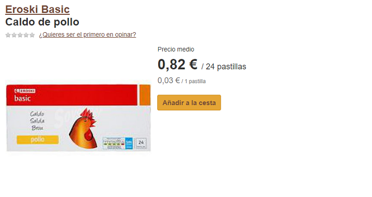 Sin duda, el líder en este aspecto, es Eroski, pues ofrece el caldo de pollo en pastillas por tan solo 0,82, en un paquete de 24 pastillas. El precio por pastilla sale más o menos por 3 céntimos, un precio sin duda muy competitivo que nos permitirá añadir mucho sabor a nuestros guisos por muy poco dinero.
