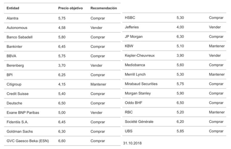 En este contexto, muchos los analistas confían en el recorridoalcista del valor. Así, de veintisiete firmas de análisis, dieciocho de ellas recomiendan comprar acciones Santander (un 67%). GVC Gaesco Bolsa es la entidad que otorga un mayor potencial de subida. Y nueve de estas firmas sitúan el valor objetivo por encima de los 6 euros: Deustche (6,50), Oddo BHS (6,50) Bankinter (6,45), Fidentiis (6,45), Goldman (6,30), JP Morgan (6,30), BPI (6,25) y Société Générale (6,20).