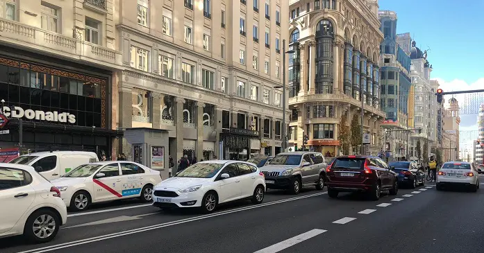 Lo cierto es que la Gran Vía podía parecer un día normal. La presencia policial ha aumentado, pero muy poco. Tan solo un furgón policial en plaza de España, Cibeles y en la Puerta de Alcalá. También se podía ver varios agentes de movilidad desplegados por las calles aledañas, pero nada destacable. Lo que más se apreciaba eran autobuses, urbanos y turísticos, taxis, vehículos VTC, y furgonetas de reparto. Se dejaban ver algunos coches particulares, pero en menor medida.