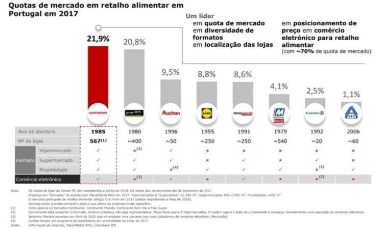 El mercado portugués minorista de alimentos se concentra entre los cinco principales jugadores, que controlan casi un 60% de participación entre ellos. Todo lo contrario que en España, donde solo una empresa (Mercadona) acapara el 25% de cuota de mercado, mientras que la segunda (Carrefour) está muy lejos de competir de tú a tú con Roig, pues alcanza el 8% de cuota de mercado.