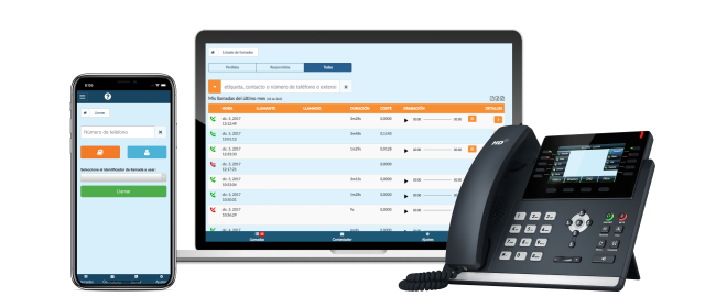 Una de sus principales ventajas es que se puede usar desde múltiples dispositivos: desde la propia app en un móvil o desde un teléfono VoIP en la oficina. En ambos casos se pueden atender llamadas, realizarlas con el número de empresa (dejando el número móvil para uso personal) y transferirlas a otros usuarios.