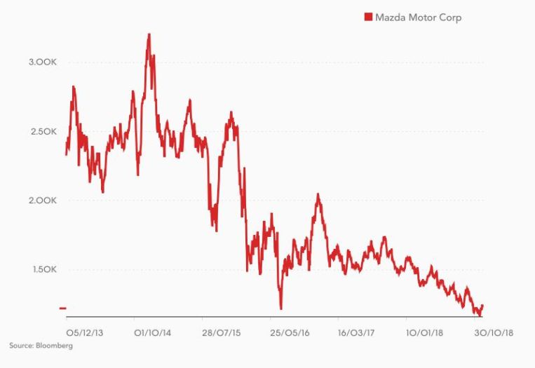 El 21 de noviembre Mazda tocó suelo. Ese día alcanzó su mínimo en cinco años. Superando, a la baja, los registros previos que las acciones de la compañía marcaron en 2016 tras el escándalo de los airbags defectuosos de Takata, que obligaron a Mazda a revisar más de un millón y medio de vehículos. En lo que va de año, la compañía ha perdido más de un 20% en los mercados. Además, en la bolsa de Estados Unidos, las participaciones siguen la misma senda.