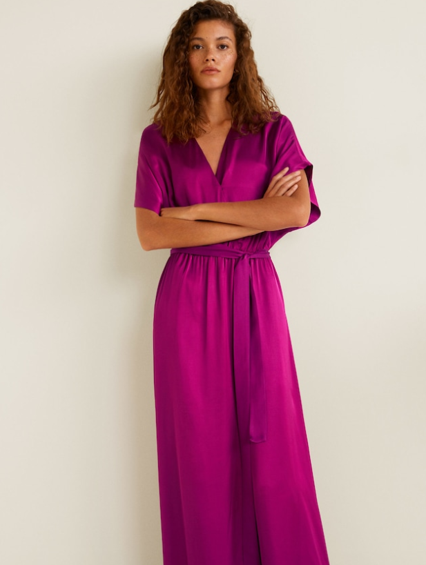 Si te ha gustado la blusa cruzada satinada, también te gustará este vestido largo satinado al ser muy similar al primer look de Mango que hemos visto. Este vestido de color granate tiene un diseño acampanado, escote en pico cruzado, manga corta, cintura elástica con lazo y una abertura en el bajo que le da el toque especial al vestido.