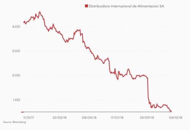 Los últimos meses en Bolsa de la cadena de alimentación no han hecho más que constatar los vaivenes en su estructura y accionariado. Con momentos tan puntuales y críticos como cuando anunció una revisión a la baja del objetivo de Ebitda a un rango entre 350 y 400 millones de euros, comparado con 568 millones de euros en 2017. Ese 15 de octubre, DIA, la empresa registró la mayor caída bursátil que se recuerda en los últimos tiempos. DIA cedió un 42% al cierre de la sesión pasando de los 1,86 euros por acción a los 1,08 euros.