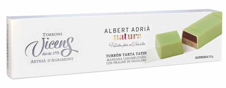 El turrón de tarta tatín es una auténtica delicia y es que está hecho con manzana caramelizada y praliné de hojaldre. Un espectáculo para todos los sentidos, sin duda alguna. Pero, ¿Cuál es su sabor? Según Albert Adrià, tiene el sabor típico a hojaldre y manzana, aunque con ese punto de praliné. Eso si, la textura es bastante crujiente, como si de un auténtico hojaldre se tratase.