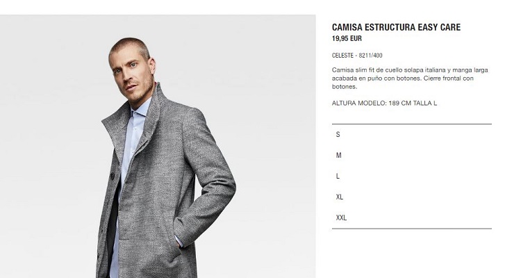 El precio de la camisa es de 19,95 euros, y viene en azul celeste. En cuanto a la composición, tenemos un tipo mixto, con un 60% de algodón, y un 40% de poliéster. En cuanto a las tallas, tenemos de la S, a la XXL. Recuerdo que el modelo mide 1,89 y usa la talla L. De todas formas, en la página web de Zara hay guías de talla para que no haya problemas.