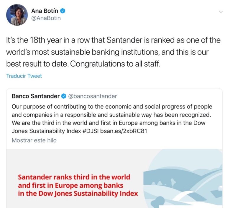 Uno de los reconocimientos a esta estrategia es la valoración que otorga al Santander el Dow Jones Sustainability Index (DJSI), índice de referencia en el ámbito internacional que mide el comportamiento sostenible de las empresas en las dimensiones económica, medioambiental y social. La entidad ha conseguido este año el mejor resultado de su historia y se sitúa como el tercer mejor banco del mundo y el primero de Europa. En su revisión de 2018, de un total de 133 entidades financieras evaluadas, sólo 27 han conseguido formar parte del DJSI World. El banco lleva 18 años formando parte de este índice de forma consecutiva, lo que refleja la consistencia en la gestión de la sostenibilidad por parte de la entidad. En este sentido, por octavo año consecutivo, Santander alcanza el primer puesto de los bancos españoles.