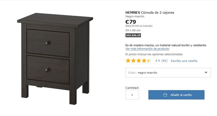 El precio es de 79 euros, y las medidas montada son de 54 centímetros de ancho, 38 centímetros de fondo y 66 centímetros de altura. El color es negro-marrón, pero también la tenemos en blanco y en tinte-blanco.