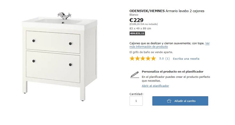 Su precio es de 229 euros, y sus medidas son de 83 centímetros de ancho, 80 centímetros de ancho del armario sin contar el lavabo, 49 centímetros de fondo y 89 centímetros de altura en total. Eso sí, el grifo de baño se vende por separado, pero lo puedes comprar en el mismo Ikea.