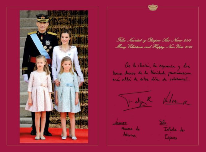 La primera felicitación navideña de los Reyes Felipe VI y Letizia fue una imagen captada el día de su proclamación, en la escalera de la Puerta de los Leones del Congreso de los Diputados y en la que aparecen junto a sus hijas, la Princesa de Asturias y la infanta Sofía. En la parte derecha de la felicitación, los Reyes expresan sus deseos de «que la ilusión, la esperanza y los buenos deseos de la Navidad permanezcan más allá de estos días de celebración».