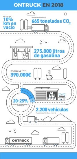 Ontruck, empresa española de transporte regional de mercancías por carretera, ha conseguido que su sistema basado en la optimización de rutas y cargas mediante el uso de tecnología se traduzca en un ahorro de 275.000 litros de combustible a lo largo de todo el año 2018, gracias a la reducción del 10% de los kilómetros que los vehículos realizan en vacío, lo que equivale a un ahorro económico estimado de 390.000€.