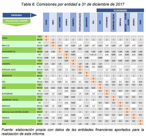 Las tres grandes entidades (CaixaBank, Santander y BBVA) siguen sin haber firmado ningún acuerdo bilateral ni multilateral con otras entidades para el uso de sus cajeros automáticos. «La extensa y capilar red de cajeros de estas tres entidades les ha permitido no tener que llegar a acuerdos con otras entidades», indica el informe de la CNMC. De esta forma, la comisión que cobran por retirada de efectivo con tarjeta de débito se ha establecido de forma unilateral. Las comisiones, para no clientes, no se han visto alteradas desde 2015 (CaixaBank 2€, BBVA 1,87€ y Santander 1,85€), manteniendo el uso gratuito para sus clientes. Los que más cobran, CaixaBank, Liberbank y Unicaja.