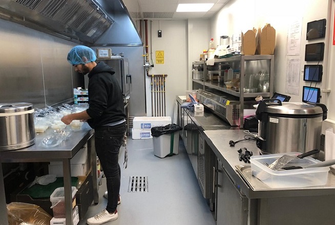 Lo primero que vemos cuando entramos en la nave, un antiguo taller de coches, es el habitáculo en el que el repartidor recoge el paquete. Hay una mesa fría y una mesa caliente, donde se depositan los pedidos que requieran calor. Hay además un monitor donde aparecen el estado de cada pedido y el tiempo de espera, a través del cual los repartidores controlan los paquetes.