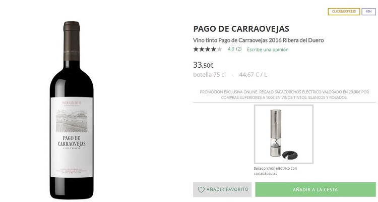 El precio es de 33,50 euros la botella de 75 centilitros. Se debe servir a una temperatura de 16 grados centígrados, contiene un 14% de volumen de alcohol, y el litro sale a 44,67 euros. Si compras 100 euros en vinos tintos, blancos y rosados en El Corte Inglés, te regalan un sacacorchos eléctrico que vale 29,90.