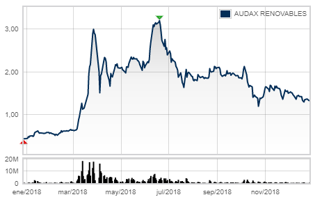 Los números rojos han campado a sus anchas por la Bolsa española durante 2018. El Ibex se ha dejado en el camino un 17% en un año que no será de esos que se suelen enmarcar. Sin embargo, en el parqué español hay un ganador nato. Un valor que se puede decir que ha nadado contra corriente y que se ha salvado de morir ahogado. Se trata de Audax Renovables.