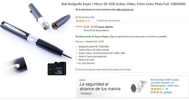 Amazon tiene toda clase de productos, desde productos de alimentación, hasta gadgets electrónicos. Sin embargo, una categoría que está arrasando y que está de moda, es la de los productos espía. Un producto espía, es un producto cotidiano, como un bolígrafo o un cargador, pero con un micrófono y/o una cámara espía dentro del mismo.