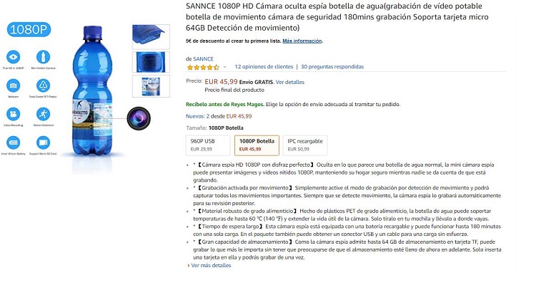 Botella de agua con cámara espía en Amazon