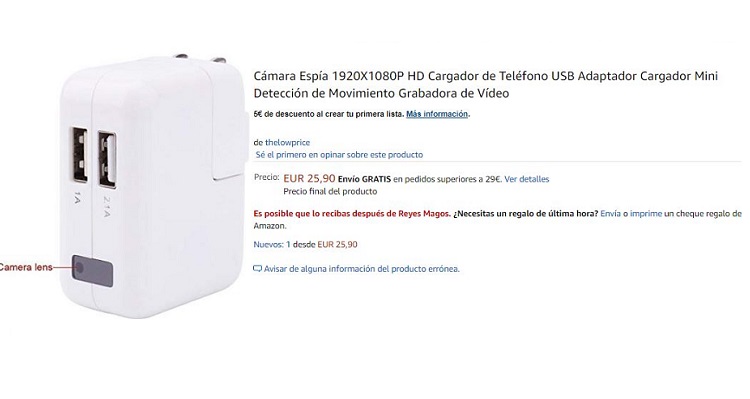 Cámara espía en cargador de móvil en Amazon
