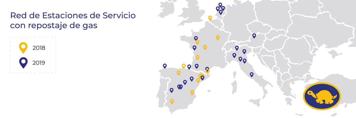 La compañía de servicios al transporte internacional se marca como objetivo triplicar esta cifra en 2019, ampliando su red de servicios por toda Europa. El repostaje de Gas Natural Licuado (GNL) y Gas Natural Comprimido (GNC) se ofrece en España, Francia, Bélgica y, próximamente, en Holanda, Italia y Eslovenia