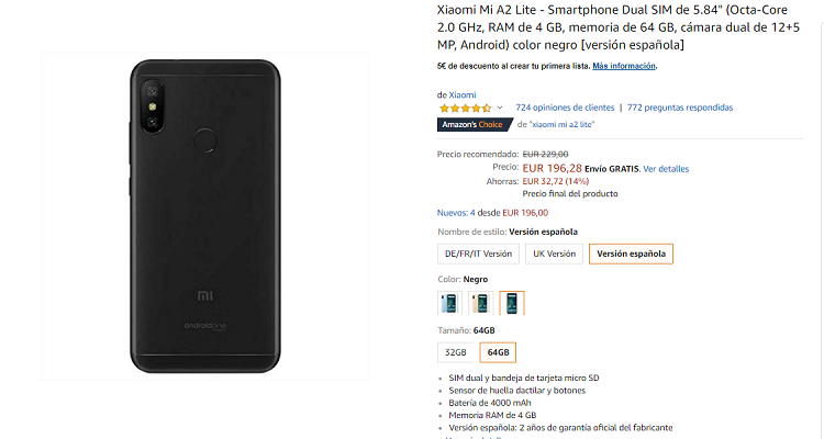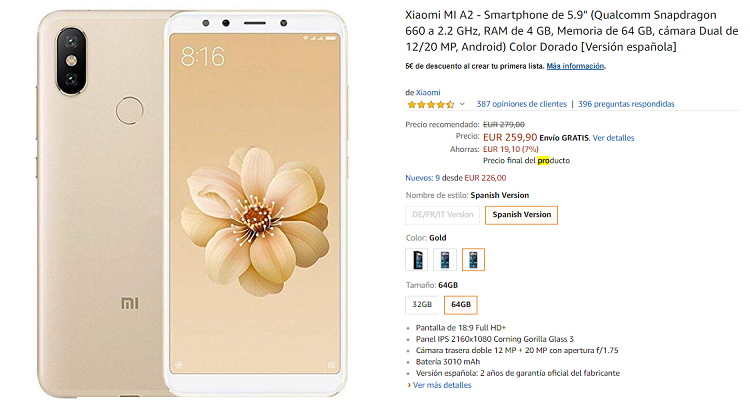 Seguimos con el Xiaomi MI A2 de la lista de teléfonos de Amazon Prime. Estamos ante un teléfono de 5,9 pulgadas, con 4 GB de memoria RAM, una cámara dual de 20 megapíxeles por detrás y 12 por delante, 64 GB de memoria, color dorado y resolución Full HD en la pantalla.