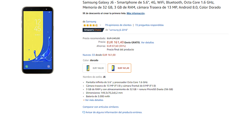 El siguiente producto de la lista de Amazon Prime, es el Samsung Galaxy J6, un móvil de 5,6 pulgadas, con 4G, pantalla HD SAMOLED, 3 GB de memoria RAM y 32 de memoria interna, ampliables por micro SD de hasta 256 GB. Cuenta también con una cámara de 13 megapíxeles para la parte de atrás, y de 8 para la parte delantera, además de una batería de 3000 mAH y color dorado.