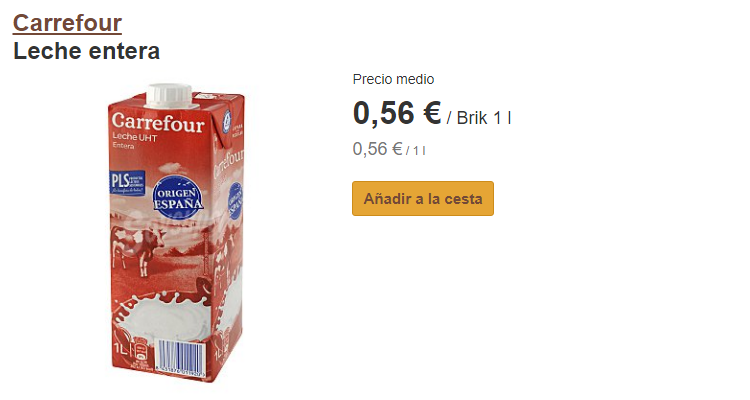 La leche más barata entre Mercadona y Carrefour, es la de Carrefour, aunque por un margen muy estrecho. Esta leche entera, cuesta 0,56 euros por cada litro. La de Mercadona costaba un poquito más, de este modo y como he dicho antes, es posible que en algunos supermercados de España, la de Mercadona valga menos dinero.