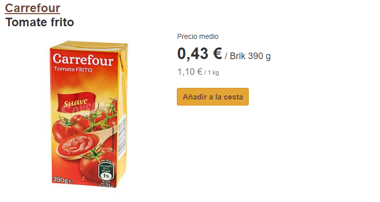 En la comparación entre Mercadona y Carrefour, gana Carrefour con su tomate frito suave. Su precio es de 0,43 euros por el brik de 390 gramos, algo que hace que el precio al kilo salga a 1,10 euros. Sin duda, un gran precio para uno de los productos más consumidos.