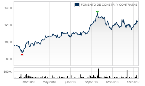 En lo que llevamos de año, la acción de FCC ha pasado de los 11,70 euros a los 12,86 euros (una revalorización cercana al 10%). Si la tendencia continúa alcista, es posible que supera el máximo alcanzado el pasado año y que se situó en 13,40 euros.