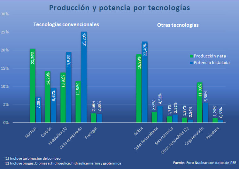 Con tan solo el 7,09% del total de la potencia instalada, los siete reactores nucleares españoles han producido 53.216 GWh netos; el 20,39% del total de la energía eléctrica.