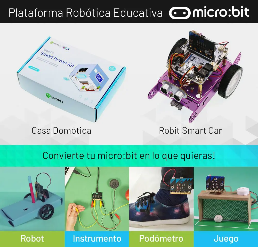 https://robotopia.es/kits-educativos/114-casa-domotica-con-microbit.html - Robit Smart Car es un kit que se añade a la tarjeta para construir en un cochecito inteligente y programarlo con MakeCode, el software de programación desarrollado por Microsoft para micro:bit.