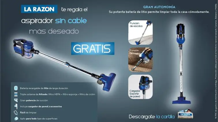 En los últimos días el reclamo es un aspirador de cable, que se consigue rellenando una cartilla con varios cupones y pagando los 14,95 euros de gastos de distribución y entrega. Este invento digiere «los ácaros del polvo, las esporas del moho o la caspa de los animales domésticos».