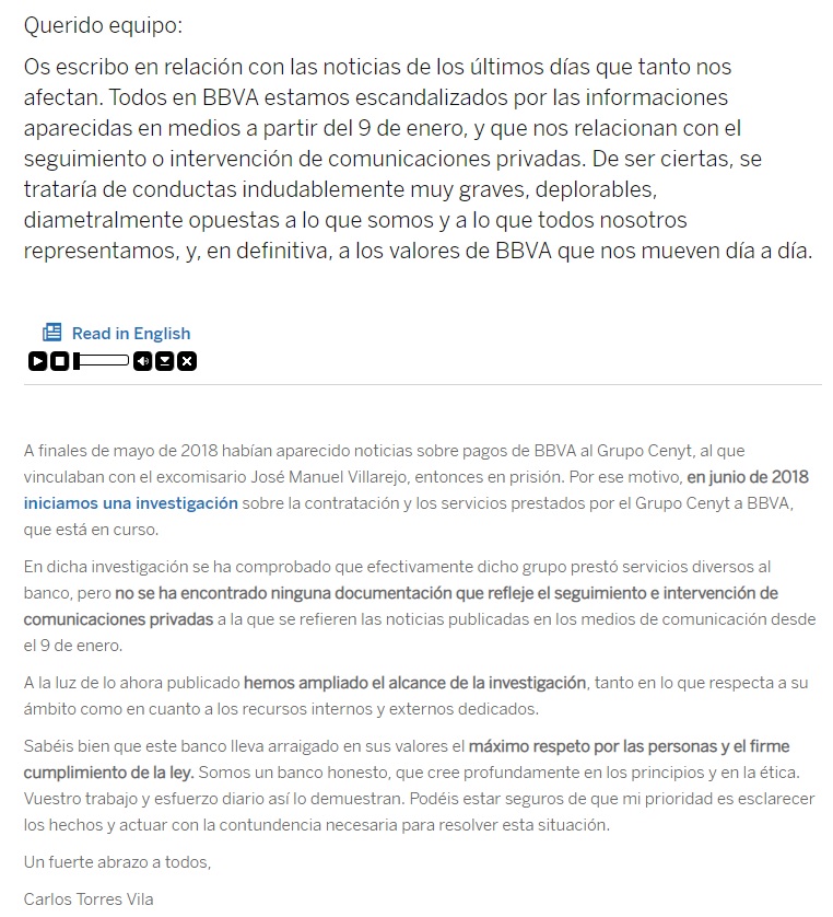 Cuatro días después del breve comunicado las noticias iban apareciendo ante el silencio del banco “sin comentarios” respondían a la prensa. En ese momento el actual presidente, Carlos Torres, se dirigió a los empleados por medio de una carta que fue inmediatamente filtrada desde el departamento de comunicación del BBVA a la prensa que les importa, la internacional. En concreto a la oficina de Bloomberg en Madrid.