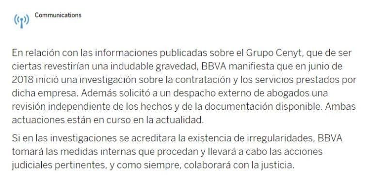 ¡Las informaciones publicadas son sobre el BBVA!, que es quién ha contratado al Grupo Cenyt. Ese es el elemento noticioso. Que Cenyt (José Villarejo) supuestamente realizaba todo tipo de actividades delictivas es público y notorio, y por eso tiene abiertas casi una decena de piezas secretas en la Audiencia Nacional. Lo que haga Villarejo, no sorprende a nadie a estas alturas. Lo escandaloso, -y el comunicado lo obvia-, es que una de las principales entidades del país contrató a una supuesta organización delictiva, para delinquir y montar una “guerra sucia”.