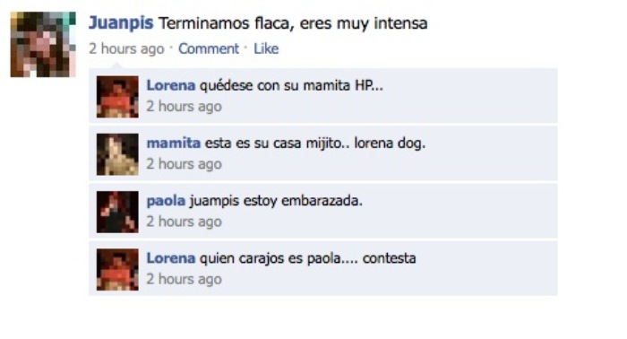 Una de las cosas que jamás deberías colgar en Facebook son las conversaciones personales, que para eso están los mensajes privados o, mejor aún, quedar en persona. Ten en cuenta que tu muro es visible para todos tus contactos (y para todo el mundo si lo tienes abierto), por lo que si tienes una conversación personal a través del muro, todos tus conocidos y amigos se enterarán de lo que estás hablando.
