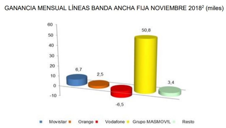 Según los últimos datos de la Comisión Nacional de los Mercados y la Competencia (CNMC) que corresponden al mes de noviembre, la compañía dirigida por Meinrad Spenger ha presentado un bizcocho [como se ve en el gráfico] bastante importante. Por lo que respecta a banda ancha fija, más de 50.000 nuevas líneas.