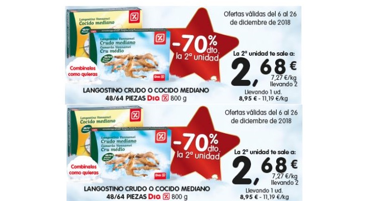 El siguiente de los chollos de Carrefour, Eroski y DIA, tiene que ver con la comida. En Navidad, siempre se comen langostinos, un plato que a todos nos encanta y que sin duda, no faltará en la mesa de casi nadie. En DIA lo saben, y por ello te ofrecen un gran descuento del 70% en la segunda unidad de las cajas de langostinos.