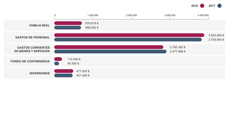 El gasto en salarios de la Familia Real ha subido en 10.866 euros, el de gastos de personal ha subido en 80.000, el fondo de contingencia ha subido a 47.000 y las inversiones han subido en 26.000. En cuanto a los gastos corrientes en bienes y servicios, han bajado 95.606 euros con respecto al año pasado, siendo lo único que baja.